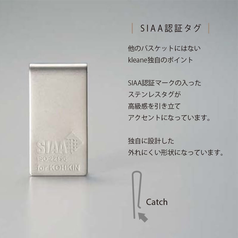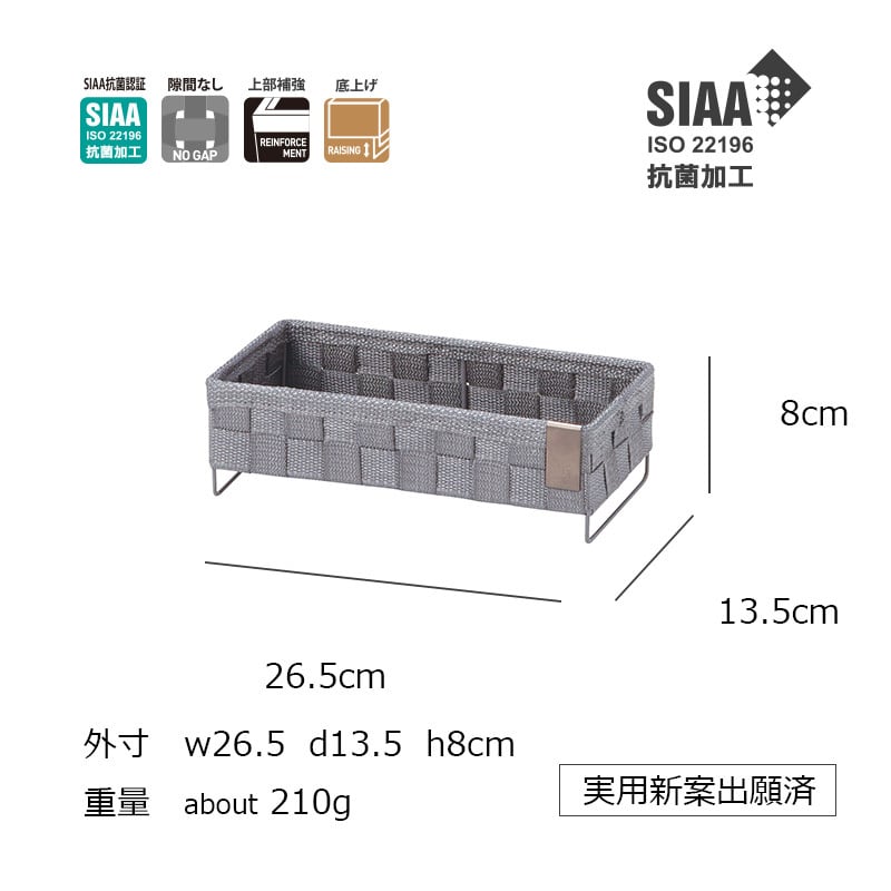KLEANE ZERO【キレーネ ゼロ】 SIAA抗菌PPバンド スチールワイヤー 外寸:約W26.5 D13.5 H6(8) cm 重量:約200g 付属:SIAA ISO 22196 抗菌ステンレスタグ付 ※ハンドメイトの商品の為、一つ一つ個体差があり表記サイズと異なる場合がございます。