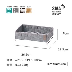 KLEANE ZERO【キレーネ ゼロ】 SIAA抗菌PPバンド スチールワイヤー 外寸:約W26.5 D19.5 H6(8) cm 重量:約240g 付属:SIAA ISO 22196 抗菌ステンレスタグ付 ※ハンドメイトの商品の為、一つ一つ個体差があり表記サイズと異なる場合がございます。